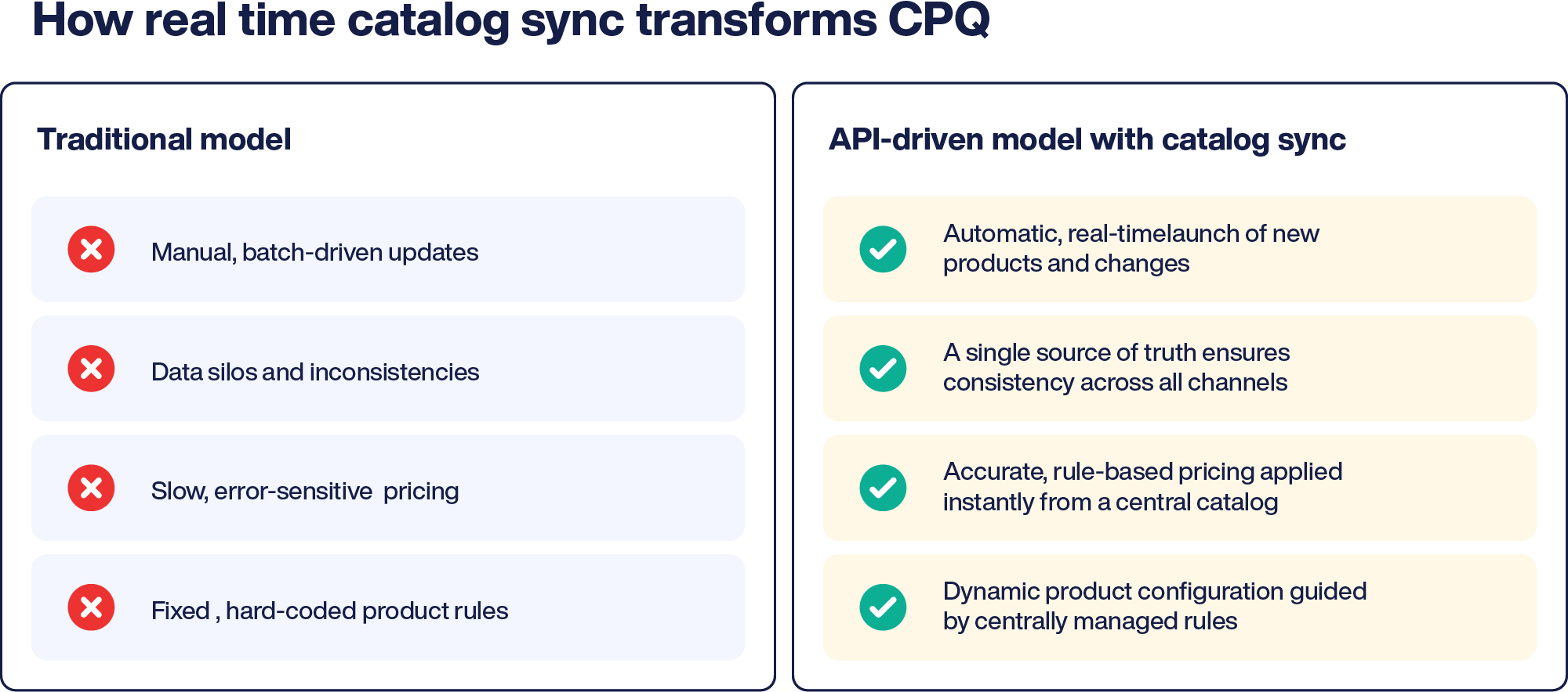 Catalog synchronization ensures consistent product definitions, configurations, pricing, and rules across all systems and channels. CPQ must always “know” the current catalog, so every quote reflects up-to-date, valid information. If Open APIs are the nervous system of digital telecom operations, real-time catalog sync is the heartbeat, keeping every connected process alive and aligned.